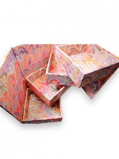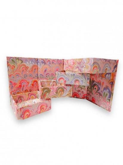 1923年創業のフィレンツェ老舗文房具店PARIONEの工房で、熟練の職人によって一枚一枚、丹念に手作りされたマーブリング紙をジュエリーボックスにまとわせた世界に一つだけの一品です。小物をいれるのにも重宝しそうな三段スライドのデザインで狭いスペースでも置いていただけます。ピンクをメインカラーにしたマーブル模様がかわいらしさと華やかさを演出してくれます。